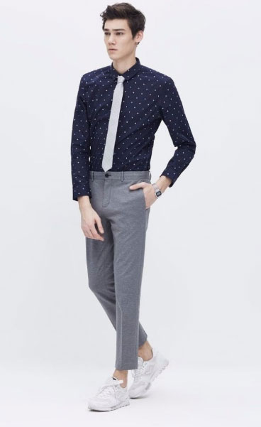 襯衫領帶與九分修身小西褲一起搭配小白鞋,顯得簡約而不簡單,在一般的工作場合都適用。