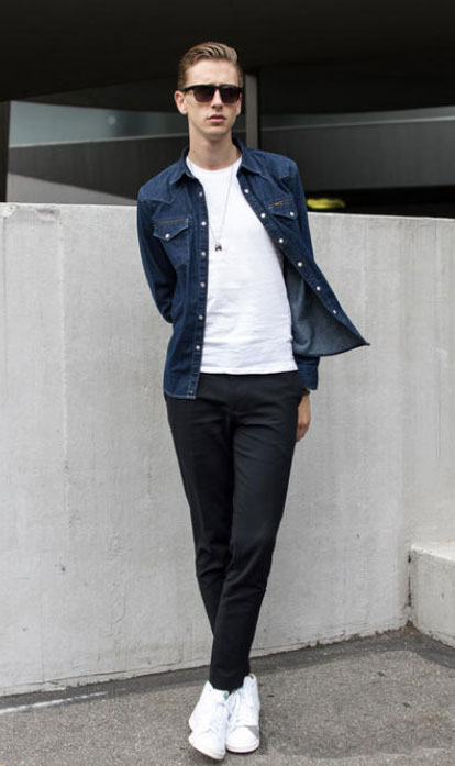 牛仔襯衫內搭白色T恤+偏休閑的黑色窄腳小西服搭配一雙迷人的小白鞋,年輕和時尚感都非常強。