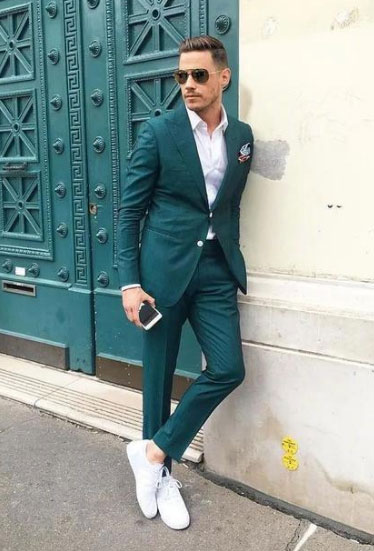 綠色西服搭配小白鞋,比較適合年輕男子,這是一種比較潮流的時尚搭配。