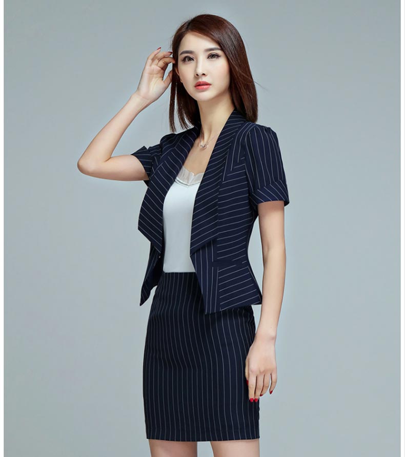 您的位置:主頁 > 西服定制 > 女士西服定制 > 深藍條紋短袖西裝套裝定制
