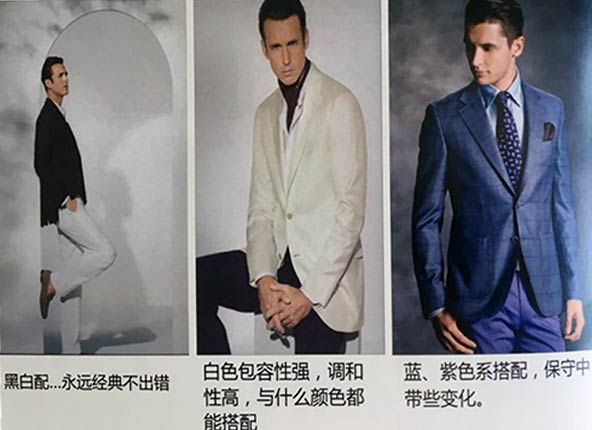 對于上下身顏色不同的西裝,合適的搭配非常重要,基本的色彩搭配多是同類色或者無彩色,比如黑白色,黑色和灰色、紫色等顏色的搭配,